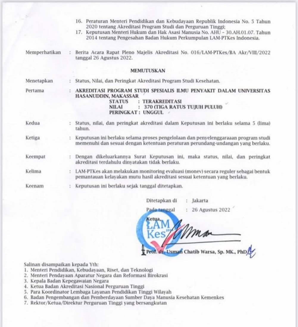 The results of the series of assessments by LAM-PTKes gave a decree in the plenary meeting on August 26, 2022, namely the Excellent Accredited Status with a score of 370 for the Internal Medicine Specialist Study Program, Hasanuddin University