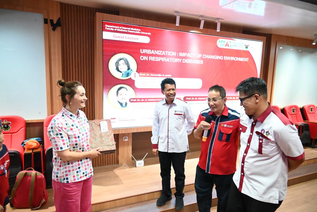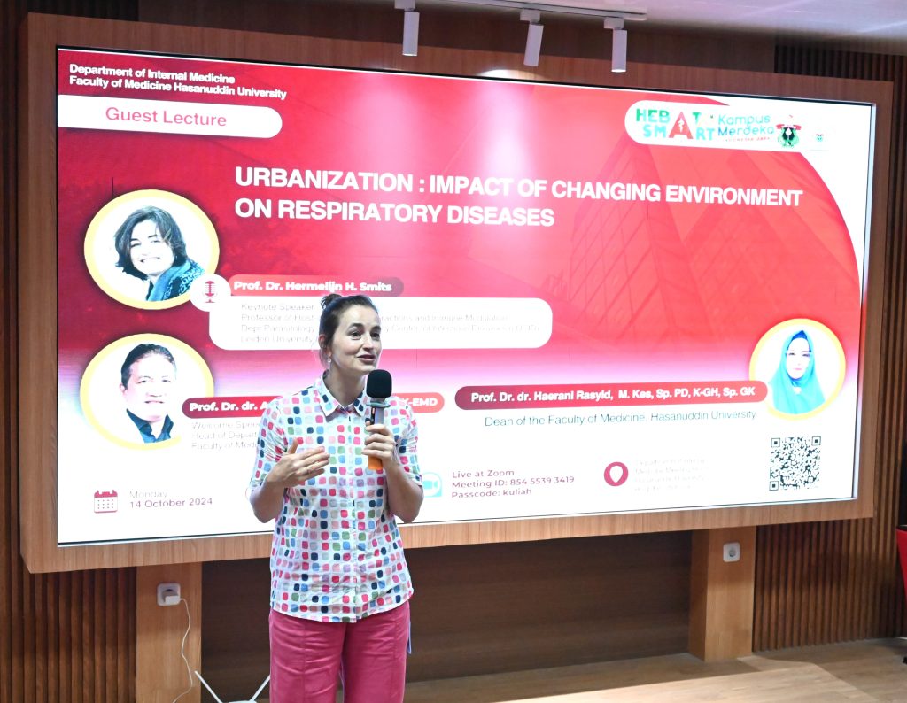 on Respiratory Diseases” Oleh Prof. Dr. Hermelijn H. Smits, yang dilaksanakan pada hari ini Senin, 14 Oktober 2024, di Ruang Pertemuan Ilmiah Departemen Ilmu Penyakit Dalam. Acara ini dibuka oleh Ketua Departemen Ilmu Penyakit Dalam, Prof. Dr. dr. A. Makbul Aman, Sp.PD, K-EMD, FINASIM, dan Wakil Dekan Bidang Riset Kemitraan, Riset dan Inovasi, Dr. dr. Andi Alfian Zainuddin, M.K.M.