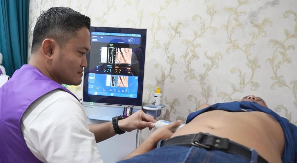 As part of Community Service program, the Department of Internal Medicine, Faculty of Medicine, Universitas Hasanuddin conducted a Fibroscan examination activity on Saturday, 30 August 2025, at Hikmah Citra Medika Hospital, Sengkang, Wajo Regency. Fibroscan is a non-invasive diagnostic tool used to assess liver stiffness and serves as an important early screening method for chronic liver diseases, particularly those within the scope of hepatology. Early identification of liver abnormalities enables timely intervention, prevents disease progression, enhances patient monitoring, and supports the development of more precise therapeutic strategies.